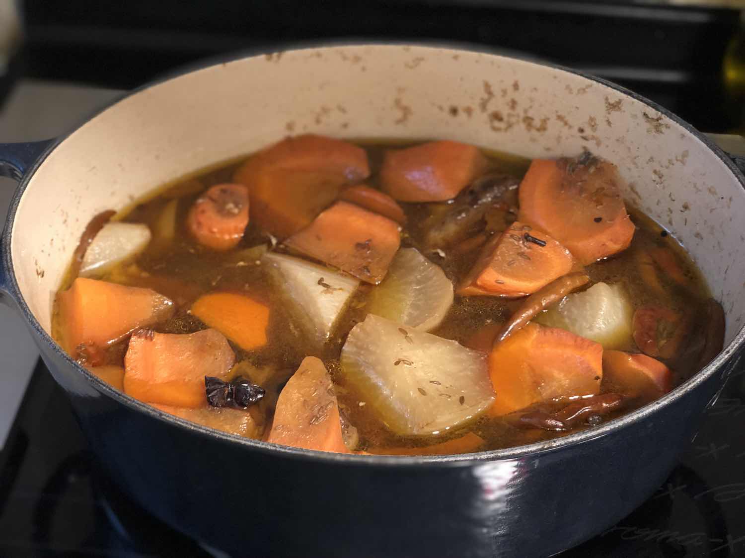 5)放紅白蘿蔔,蓋上蓋再炆30分鐘